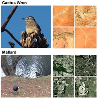 BirdSAT unifies cross-view contrastive learning and masked autoencoders to jointly learn from paired ground-level bird images and satellite imagery. The resulting model supports both fine-grained bird species classification and geographic species distribution mapping.