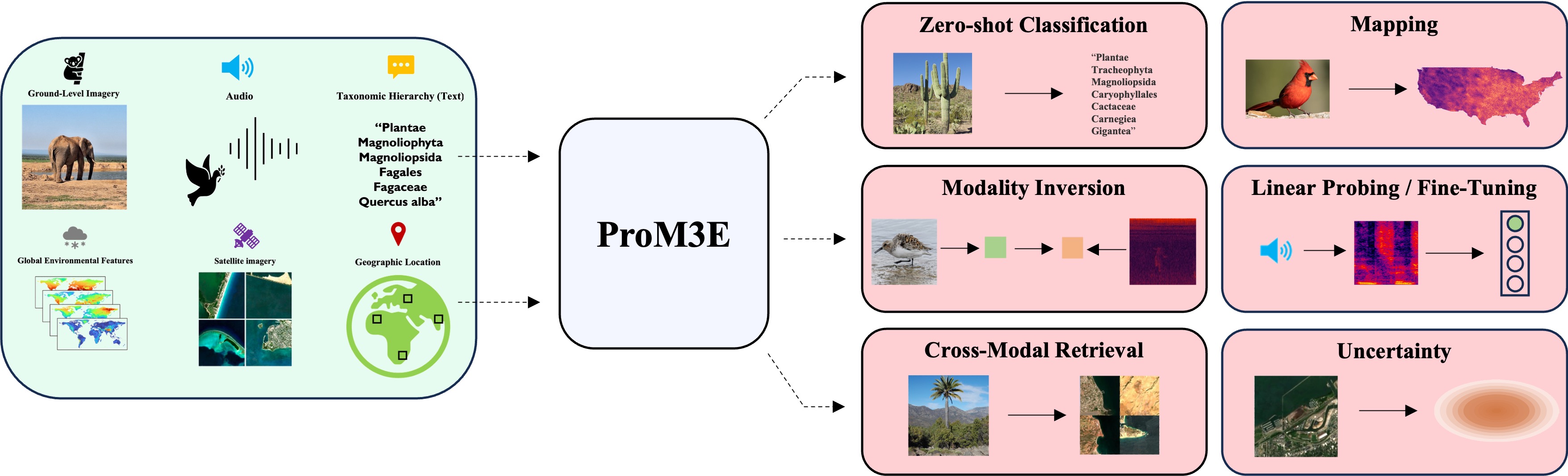 ProM3E is a probabilistic masked multimodal embedding model for any-to-any generation of multimodal representations for ecology. It learns to infer missing modalities given a few context modalities and proposes a novel cross-modal retrieval approach that mixes inter-modal and intra-modal similarities to achieve superior performance across all retrieval tasks.